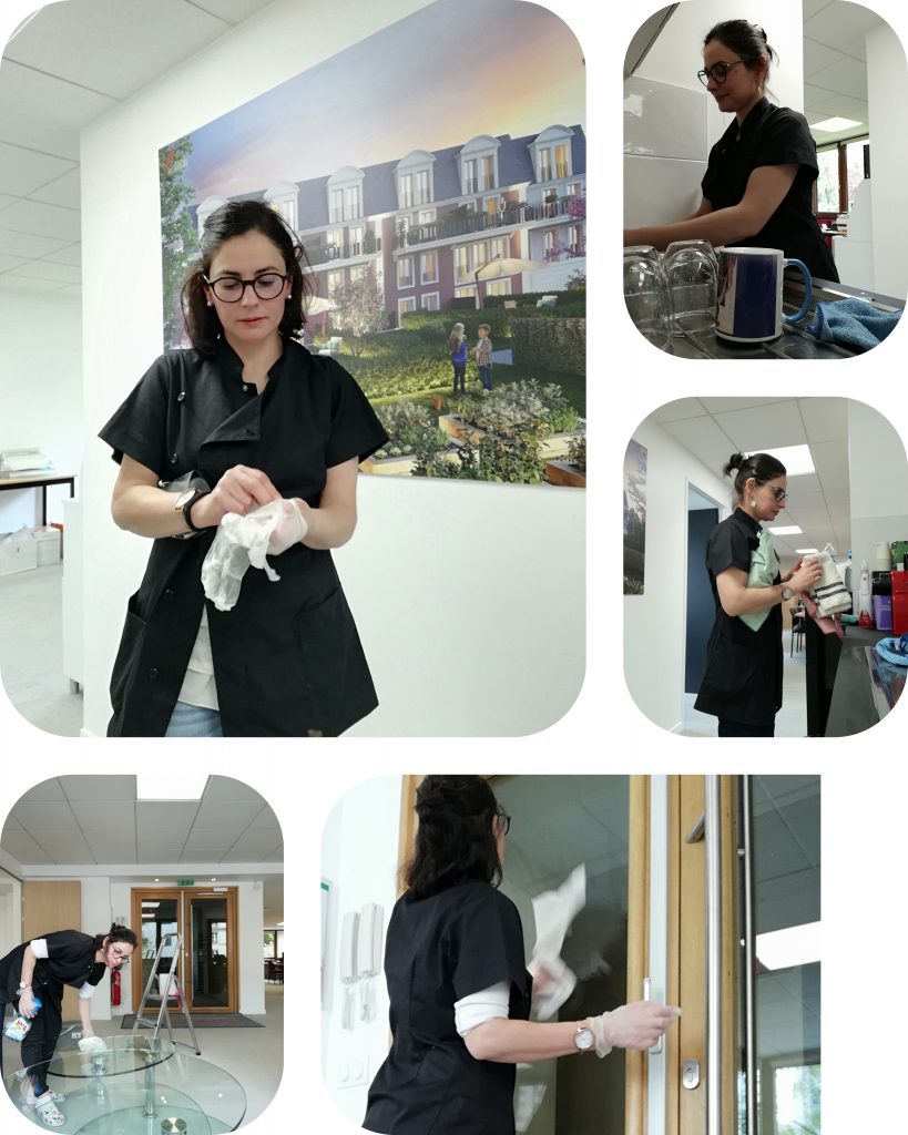 - Dépoussiérage et désinfection des équipements (téléphones, claviers, poignées de porte …).